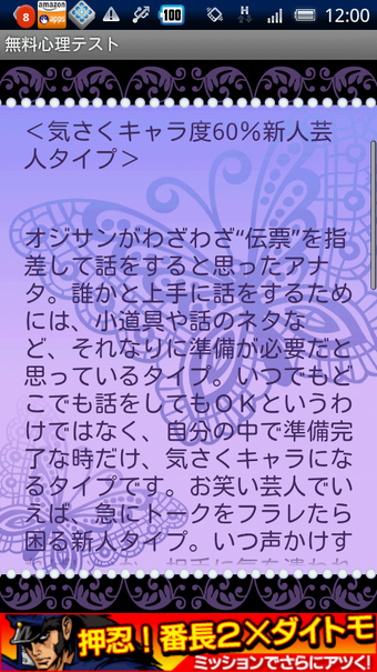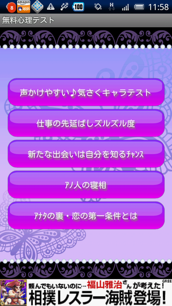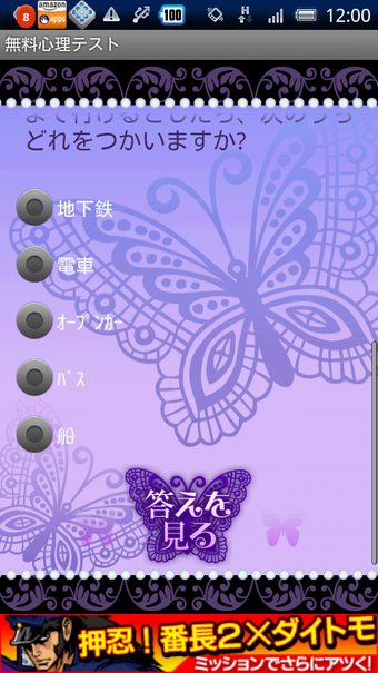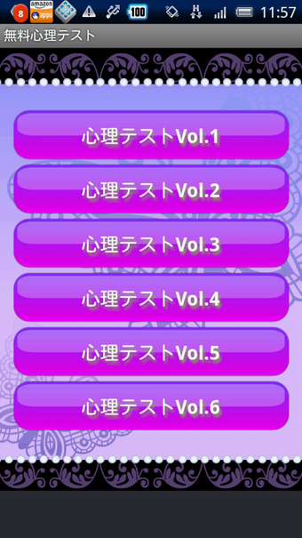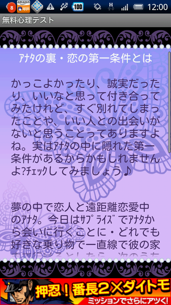 無料心理テストを開くと、紫色のおしゃれな画面にVol.1~6に分かれた心理テストメニューが現れます。いずれかを選ぶと「恋人との付き合い方チェック」などのタイトルが現れ、その先に設問があります。例えば、「山登りのゴールにたどり着いたら何をしたいですか?叫ぶ/祈る/酒/写メ(略)」という質問に答えると、回答者が陥りそうな「無駄使いシチュエーション」などを教えてくれます。解説は丁寧で、ちょっとした豆知識や行動のアドバイスもついています。当たるかどうかは当然人それぞれです。