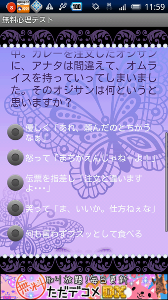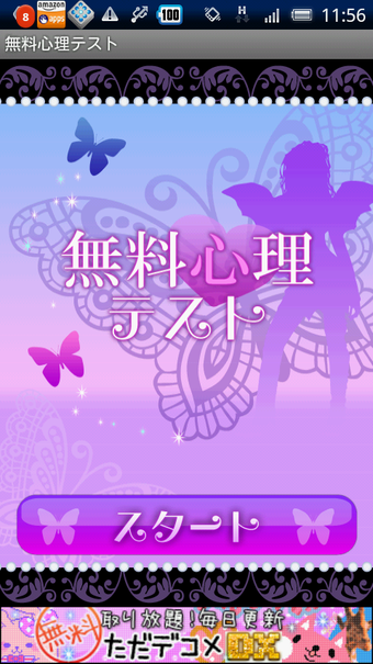 無料心理テスト~あなたの深層心理を探る~(以下無料心理テスト)は、恋愛や仕事をテーマにした女性向け心理テストが収録された無料のお楽しみアプリです。回答者が恋しているときに取ってしまう行動や、密かなる願望、取り繕っている弱点などが見事暴かれるかもしれません。4~5択の質問と診断結果がセットになっており、1問につき数分とかからずに楽しめます。女子会の場を盛り上げるネタや友達との話題のきっかけとして、または自分の恋愛を診断するために使ってみませんか。